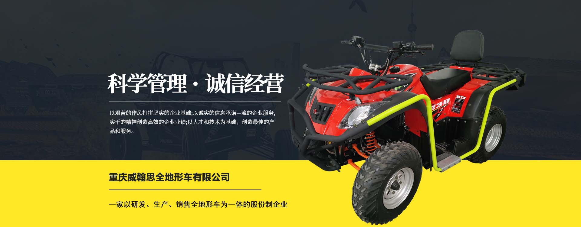 重慶威翰思全地形車有限公司成立于2016年9月,一家以研發、生產、銷售全地形車為一體的股份制企業。公司銷售額超過5000萬。現有專業市場售后服務團隊。公司秉承“敬業、超越、活力、用戶至上”的企業精神,“以人為本,合作共贏;”的核心價值觀,“嚴格管理創優質、名牌戰略拓市場”的質量方針,使公司一步步邁上新的臺階。公司與重慶航天巴山摩托車制造公司達成戰略合作協議。共同出資致力于沙灘車旅游市場產品研發,項自運營指導,市場維護等全方位市場拓展。重慶航天巴山摩托車制造公司授權;重慶威翰思全地形車有限公司為中國區唯─戰略合作伙伴。
